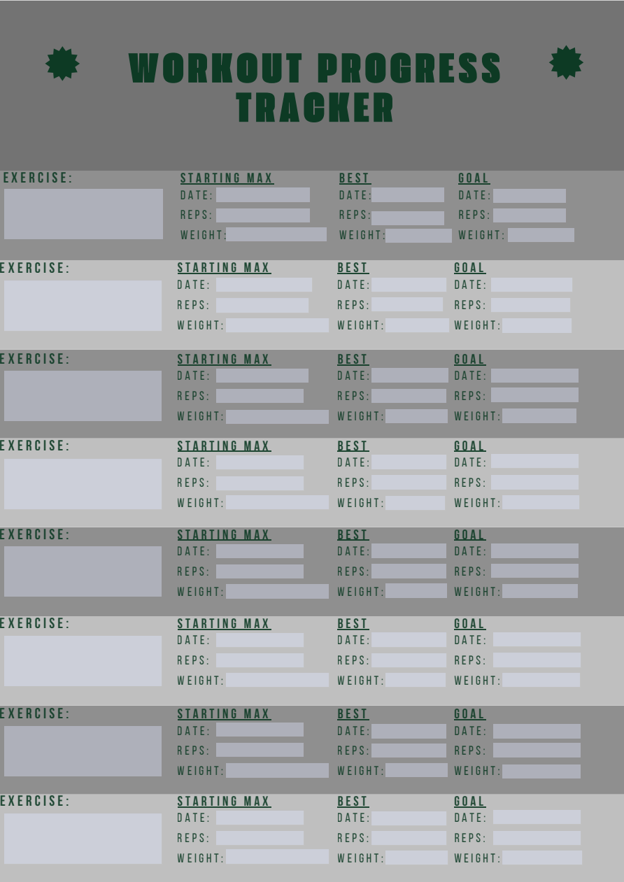 Take control of your fitness journey with the Workout Progress Tracker! This digital tool helps you track your starting point, set clear goals, and monitor your progress in reps and weight for each exercise. Whether you're lifting heavier, increasing endurance, or fine-tuning your routine, this tracker keeps you accountable and motivated. Perfect for beginners and experienced lifters alike, it's the ultimate companion for structured and measurable gains.